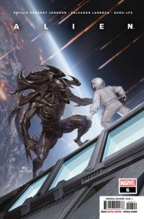W Alien #6 po ostatnim brutalnym spotkaniu z Iris, Gabe naprawia statek, by uratować Danny'ego i wrócić do domu. Najpierw czeka go jednak zmierzenie się z największym drapieżnikiem w kosmosie. Gdy bierze się za reperowanie, zdaje sobie sprawę, że nie jest sam. Alfa jest z nim na zewnątrz, co jest o tyle niebezpieczne, że kończy mu się czas. Jest to też intrygujące, ponieważ walki na otwartej przestrzeni są czymś niezwykłym w serii. Gabe nie ma gdzie się ukryć i ma ograniczoną mobilność w swoim skafandrze. Tylko magnetyczne buty pozwalają mu poruszać się po zewnętrznej stronie statku. Alfa za to czuje się doskonale na zewnątrz i nie ma żadnego problemu z przemieszczaniem.