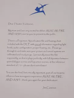 Cameron w specjalnej odezwie do pracowników technicznych kin przypomina im o własnych rekomendacjach w kwestii "ustawiania poziomu światła, konfiguracji dźwięku i prawidłowego kadrowania". Przed wyświetleniem filmu Avatar: Ogień i Popiół reżyser polecił raz jeszcze przeczytać swoje instrukcje, tak, aby systemy odpowiadające za obraz i dźwięk były "odpowiednio skalibrowane i gotowe do użycia".