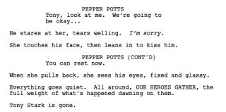 Portal comicbook.com wyciągnął z niego ciekawostkę ze sceny śmierci Iron Mana. W ostatnim momencie, gdy Pepper Potts do niego mówi, towarzyszy mu jedna myśl: przepraszam i jako że nie może mówić, według scenariusza ma to wyrazić oczami.