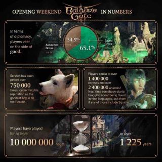 Larian Studios, a więc twórcy Baldur's Gate 3, opublikowali serię infografik przedstawiających statystyki dotyczące tej produkcji. Dzięki nim możemy dowiedzieć się, jakie klasy, rasy czy postacie cieszą się największą popularnością wśród graczy. Nie brak jednak także zdecydowanie bardziej nietypowych statystyk. Ujawniono między innymi, ile czasu spędzono w kreatorze postaci, czy też jak wiele razy pogłaskano Drapka, "najgrzeczniejszego pieska w Zapomnianych Krainach". Ciekawy jest również fakt, że 368 graczom udało się ukończyć główny wątek fabularny w premierowy weekend - a to brzmi jak spore wyzwanie, bo mówimy przecież o gigantycznym RPG na dziesiątki lub nawet setki godzin.