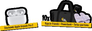 Nagrody dodatkowe w pierwszym tygodniu to słuchawki Apple Airpods Pro 2 oraz 10 zestawów z torbą sportową, kapciami Friends i power bankiem.