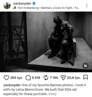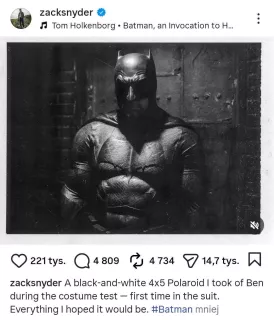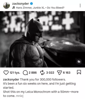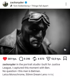 Zack Snyder opublikował nowe zdjęcia Bena Afflecka jako Batmana, by uczcić kamień milowy w swojej instagramowej karierze, ponieważ w sześć tygodni zdołał zebrać 300 tysięcy obserwujących. „Dopiero zaczynam” — zapowiedział reżyser Ligi Sprawiedliwości.