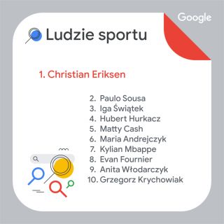 2021 rok upłynął użytkownikom wyszukiwarki Google pod znakiem sportu. Jeśli spojrzymy na hasła, które w skali globalnej najszybciej zyskiwały na popularności w ostatnich kilkunastu miesiącach, uświadomimy sobie, że osiem pierwszym miejsc związanych jest z zawodowym sportem, zaś podium zostało zdominowane przez rozgrywki krykieta. Dopiero na dziewiątym miejscu uplasowało się hasło spoza tej grupy, czyli netfliksowy serial Squid Game.