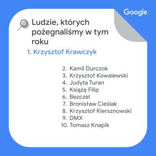 Polska lista jest co prawda bardziej zróżnicowana, ale na jej szczycie również znajdziemy hasło powiązane ze sportem. W 2021 roku nasi rodacy najczęściej wyszukiwali treści związane z mistrzostwami Euro 2021, na drugim miejscu znalazła się postać zmarłego artysty Krzysztofa Krawczyka, a podium zamyka hasło „Spis powszechny”.