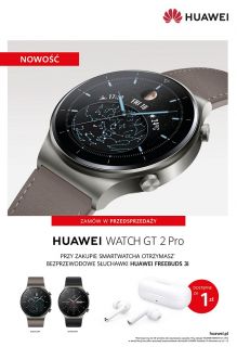 Huawei Watch GT 2 Pro wyceniono na 1399 zł. Jeśli zakupimy go w przedsprzedaży trwającej do 30 września, za 1 zł otrzymamy bezprzewodowe słuchawki Huawei FreeBuds 3i.