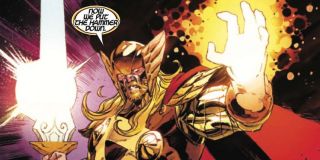 Marvel w komiksie Thor #22 pokazał starcie protagonisty z bogiem młotów, istotą będącą połączeniem obdarzonego świadomością Mjolnira i Mangoga - o tej batalii informowaliśmy Was w tym miejscu. Przypomnijmy, że w wyniku bitwy Odyn stracił życie, a przed swoją śmiercią obdarzył syna swoją wszechpotężną mocą; aby ją w pełni wchłonąć, bóg burzy korzysta teraz z zupełnie nowej, złotej zbroi.