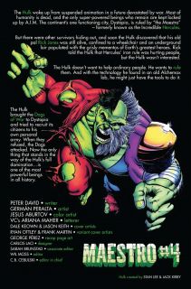 W zeszycie Maestro # 4 Petera Davida, Germana Peralty, Jesusa Aburtova i Ariany Maher opowieść podąża za przyszłą wersją Hulka, który budzi się w dystopijnej przyszłości. Hulk chce rządzić i gdy odkrywa, że Herkules przewodzi jednemu z nielicznych funkcjonujących miast, decyduje się na atak. Gdy w końcu Hulk próbuje pokonać byłego kumpla i stara się go uderzyć, ten chwyta jego dłoń, podrzuca go, łapie za stopę i... uderza nim o ziemię.