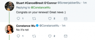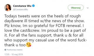 Przepis na amerykański sen to serial komediowy stacji ABC, który powróci z kolejnym sezonem. Wygląda na to, że Constance Wu nie jest z tego powodu zadowolona. Wyrażała to w sposób bardzo ekspresywny na Twitterze. Gdy ktoś z fanów pogratulował jej przedłużenia, mówiąc: to dobra wiadomość, odpowiedziała: nie, nie jest.