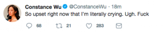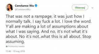 Constance Wu niektóre swoje wypowiedzi usunęła z Twittera i Instagrama. Zachodnie media jednak zdążyły zrobić zrzut ekranu, by ukazać specyficzność sytuacji i emocje aktorki.
