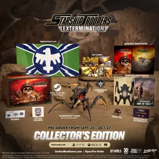 Wewnątrz kolekcjonerskiego pudełka z grafiką, której autorem jest PETROL, znajdziemy figurkę Warrior Bug o wymiarach 200 m x 319 mm x 276 mm, flagę Federacji, certyfikat autentyczności, naklejki, metalową przypinkę, haftowaną naszywkę, tatuaż, 2 dwustronne plakaty oraz 4 karty. Nie zabraknie też gry na wybraną platformę - w przypadku PS5 lub Xbox Series X|S będzie to fizyczny nośnik, a wersja PC to kod Steam.