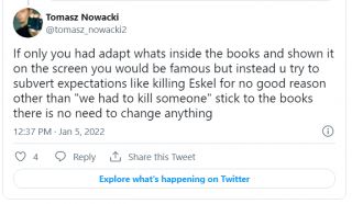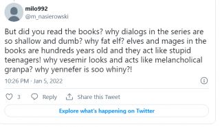 Nie ma adaptacji idealnych i chyba żaden fan Wiedźmina nie spodziewał się, że serial może być lepszy od książek Sapkowskiego, ale zbyt duże i radykalne zmiany sprawiają, że słowa twórczyni nie wszystkim się spodobały. Grupa widzów wyraziła swój zawód pod wpisem showrunnerki na Twitterze.