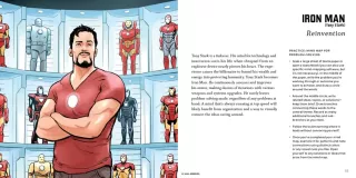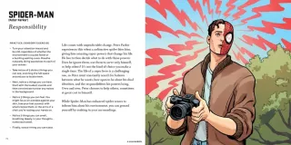 Poniżej możecie zobaczyć, jak wygląda książka i czego możecie spodziewać się w środku. Oczywiście, na okładce mamy Hulka, giganta Marvela, znanego z dość ognistego temperamentu. Jednak na ilustracji siedzi w pozie do medytacji z uśmiechem na ustach, a nie depcze wrogów jak Godzilla. Za to na kolejnych planszach możemy zobaczyć między innymi takich herosów jak Kapitan Marvel, Iron Man, Czarna Pantera czy Spider-Man.