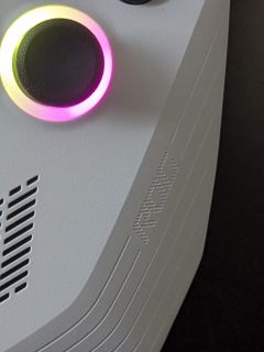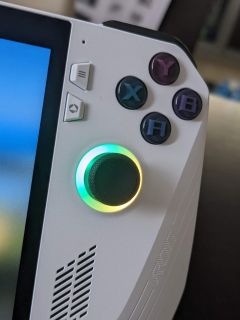 ASUS postawił na typową bryłę, a ich urządzenie przypomina Steam Decka i Nintendo Switch. Po lewej stronie znajdziemy gałkę analogową, d-pad oraz dwa przyciski, po prawej zaś znalazły się przyciski ABXY, druga gałka analogowa oraz kolejne dwa przyciski funkcyjne. Do tego dochodzą jeszcze dwie płaskie łopatki z tyłu oraz po jednym triggerze i bumperze z każdej strony. I w zasadzie tylko do tego ostatniego elementu mógłbym się nieco przyczepić. Zarówno triggery, jak i bumpery są płaskie i dość niewielkie, przez co do korzystania z nich trzeba się przyzwyczaić. Nawet po kilku godzinach zdarzało mi się naciskać nie to, co chciałem.