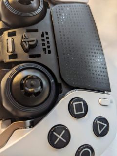 Ostatnią nowością (przynajmniej z tych wizualnych) jest dodatkowy suwak na dolnej części Edge'a. Używa się go do zwolnienia blokady trzymającej w miejscu plastikową ramkę otaczającą analogi. Cały pad wykonany jest bez zarzutu, ale ten element budzi we mnie pewne obawy. Wykonany jest raczej z cienkiego plastiku, więc nie jestem przekonany co do jego trwałości. Do tego lśniący czarny kolor, choć początkowo efektowny, lubi się rysować – doskonałym przykładem jest centralny panel w samym PS5.
