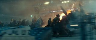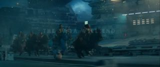 Najwyraźniej dojdzie do kulminacyjnej bitwy i to wyjaśnia, dlaczego bohaterów mogą szarżować na wierzchowcach, czyli tzw. Orbakach z planety Pasaana. To w tym wątku kluczowa będzie nowa postać Jannah grana przez Naomie Ackie, którą widzimy na czele szarży razem z BB-8. Sama aktorka mówiła, że umiejętności jej postaci staną się ważne w kulminacji. Zwróćcie uwagę podczas scen walk w przestworach, że w jednych momentach widać chmury w tle, a w innych coś dziwnie "stałego". Spekulacja: ta bitwa rozgrywa się wewnątrz lodowej konstrukcji, gdy statki jeszcze z niej nie wyleciały. W scenie kadru z wieloma okrętami widzimy, jak jeden po prawej startuje. W przestworzach natomiast można dostrzec tzw. TIE Daggery, które według informacji z kanonu są stricte związane z flotą Sithów, czyli najpewniej to armia Palpatine'a.