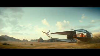 Na tej planecie widzimy też akcję z Poe, Finnem i Threepio. Istotna jest tutaj scena pościgu za bohaterami. Wszystko wskazuje na to, że to żołnierze Najwyższego Porządku. Jeden jedzie po ziemi na ścigaczu, a dwóch leci w powietrzu dzięki plecakom odrzutowym. Zauważyliście, że w scenie na skałach Finn trzyma kij należący do Rey? Na zdjęciach z panelu było widać, że bohaterka będzie go używać, więc być może miecz świetlny Skywalkerów pojawi się w późniejszym etapie historii, tak jak spekulowałem ciut wyżej. A do tego widzimy, że Rey ma swój blaster z poprzednich części.
