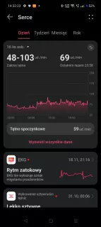 Kolejną funkcją, którą uważam za nieocenioną, jest pomiar EKG. Pomiary są wiarygodne i dokładne, a sprawdzanie sztywności tętnic jest pomocnym narzędziem do śledzenia stanu układu sercowo-naczyniowego. Wszystkie dane zdrowotne są gromadzone i synchronizują się z moim smartfonem za pośrednictwem aplikacji Huawei Zdrowie.
