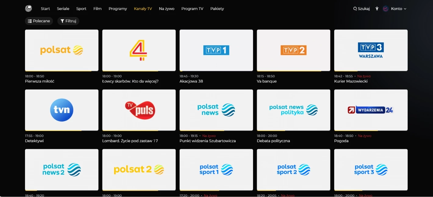 - Pełnoprawną telewizję linearną (multum kanałów, w tym newsy i rozrywka).