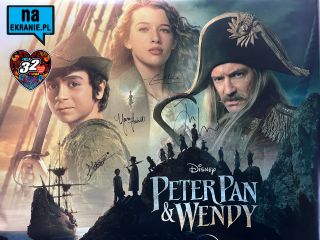 Plakat z filmu Piotruś Pan i Wendy z autografami: Jude'a Law, Ever Anderson, Alexandra Molony'ego i Yary Shahidi