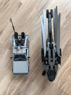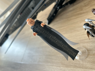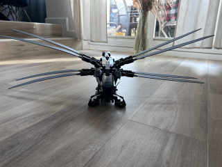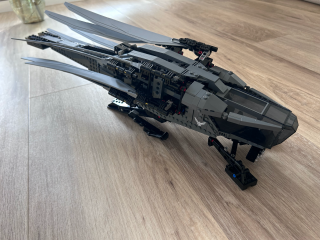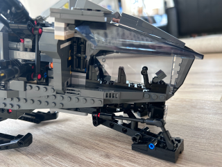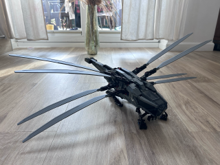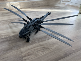 Atreides Royal Ornithopter ma kilka ruchomych elementów, dzięki czemu zestaw jest naprawdę ciekawy. Zacznijmy od wielkich rozkładanych skrzydeł zwiększających znacznie objętość zestawu. Jego wymiary to: 23 cm wysokości, 79 cm szerokości i 57 cm długości. Jak więc widzicie, potrzeba na niego sporo miejsca ma półce czy biurku. Podkreślę tylko, że ze złożonymi skrzydłami nie wygląda on tak okazale. Do tego dochodzi jeszcze wysuwane podwozie umożliwiające stabilniejsze postawienie maszyny. Byłem zaskoczony, bo model wygląda tak samo dobrze jak na zdjęciu, a nie zawsze tak jest.