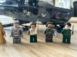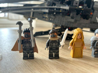 Fajny dodatek do zestawu stanowią figurki. Dostajemy ich aż osiem: Paula Atreides, Lady Jessikę, Gurneya Hallecka, Chani, Leto Atreidesa, Liet Kynes, Ducana Idaho i barona Harkonnena w czarnej długiej szacie. Brakuje mi tylko jakiejś podstawki z logo filmu, by można było te wszystkie postacie ładnie postawić obok zestawu. A tak część z nich trzeba upchnąć do środka, a reszta po prostu stoi obok.