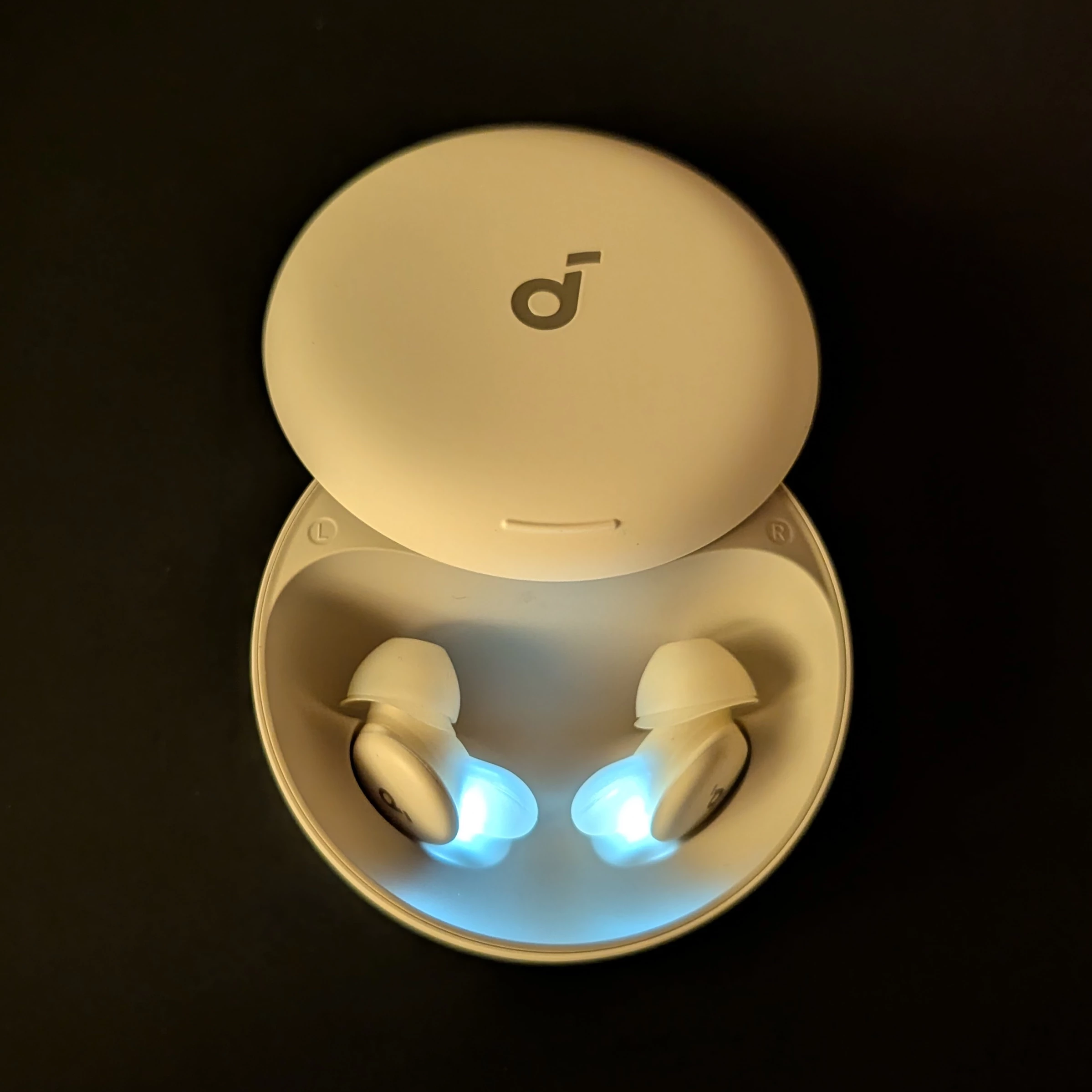 Soundcore deklaruje 9 godzin pracy w trybie lokalnym (ANC przy 50% głośności) i 6,5 godziny w trybie Bluetooth, a etui zapewnia dodatkowe 45/35 godzin w zależności od trybu. Testy w rzeczywistych warunkach dają zbliżone wyniki, ale raczej w dolnych niż górnych granicach. Nie da się więc słuchać muzyki lub audiobooka ze smartfona przez całe osiem godzin nocnego odpoczynku. Małe rozmiary słuchawek okupione są tu czasem pracy, który jest krótszy w stosunku do modelu A20, który pozwalał słuchać całą noc. Stąd też dość agresywnie działające wykrywanie snu, które przełącza w tryb lokalny, żeby oszczędzać baterię.