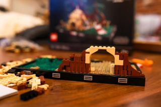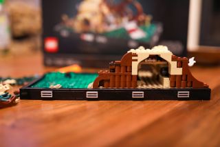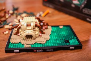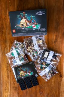 Efekt jest piorunujący. Pomijam już fakt, że inżynierowie LEGO poprawili wygląd samej chatki, to jeszcze dołożyli do niej całe otoczenie, które oddaje klimat planety Dagobah. Jest mokro, mrocznie, zielono, dokładnie tak jak powinno być. Podczas składania tego zestawu można się nieźle zmęczyć, wpasowując skrupulatnie małe przejrzyste zielone klocki, które mają imitować bagna, z których wystaje raptem jedno skrzydło zatopionego X-Winga. Jest ich mnóstwo. Jedna paczka jest wypełniona tylko nimi. Gdy się je wysypuje na stół, zaczynają się wizualnie zlewać w jedną klockową masę. Tych elementów jest naprawdę dużo, a układanie ich trochę zajmuje. Już przy Dioramie: Szturm na Gwiazdę Śmierci byłem pod wrażeniem dbałości o szczegóły. Wtedy chodziło o szare rurki i inne elementy wyposażenia Gwiazdy Śmierci. Tu inżynierowie zaprojektowali moczary i dżunglę, które wyglądają przepięknie, ale wymagają cierpliwości i precyzji.