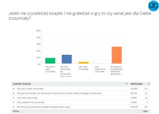 Sonda wykazuje, że coś jednak jest na rzeczy. Choć biorący udział w badaniu oceniają serial dość wysoko, większość z nich przyznała, że znajomość książek (również gier) była bardzo pomocna przy oglądaniu i rozumieniu produkcji. Prawie 27% głosujących, choć uznaje serial za zrozumiały, twierdzi, że momentami ma poczucie braku wiedzy, dlaczego coś się wydarzyło. W sumie prawie 33% miało większy lub mniejszy problem ze zrozumieniem produkcji w pełni. Większość uważa, że znajomość książek czy gier pomaga im w oglądaniu.