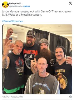 Jason Momoa (Aquaman, Diuna, Gra o tron, Fast X) od dawna jest wielkim fanem zespołów heavymetalowych, w tym Metalliki. Pod koniec sierpnia 2023 roku aktor miał okazję wybrać się na koncert zespołu w Los Angeles wraz z gwiazdorami z Hollywood, w tym między innymi twórcą serialu Gra o tron, D.B. Weissem, oraz Johnem Travoltą. Jason Momoa nie tylko miał okazję zrobić sobie pamiątkowe zdjęcie z członkami Metalliki, ale też szalał z innymi fanami pod sceną. Jeden z internautów podzielił się nagraniem z udziałem gwiazdora w mediach społecznościowych.
