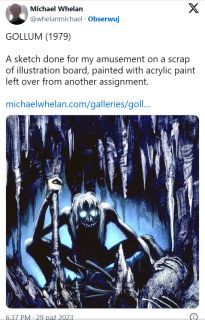 W jednym z wpisów na swoim profilu na Twitterze Michael Whelan postanowił podzielić się z internautami ilustracją Golluma. Narysował ją w 1979 roku. Twórca wyobraził sobie bohatera w jeszcze bardziej niepokojącej odsłonie, niż ta, znana z powieści oraz filmów z uniwersum Tolkiena. Michael Whelan opisał swoje dzieło następująco: