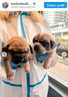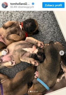 Tom Holland podzielił się zdjęciami w towarzystwie szczeniaków na swoim profilu na Instagramie. Aktor podpisał wpis ''Szczeniaczki'', jednak nie zdradził, dlaczego wraz z Zendayą postanowili odwiedzić fundację dla zwierząt. Warto wspomnieć, że Tom Holland ma już psa rasy Staffordshire Bull Terrier o imieniu Tessa. Niewykluczone, że para w przyszłości zdecyduje się na kolejnego psa. Na jednym z poniższych zdjęć możecie zobaczyć, jak Zendaya trzyma szczeniaka na rękach: