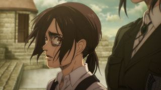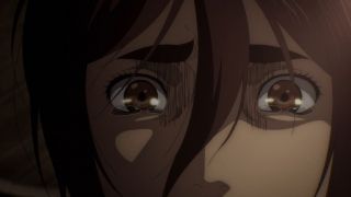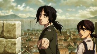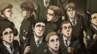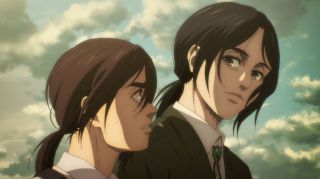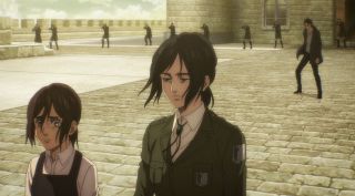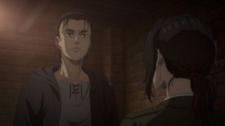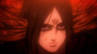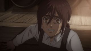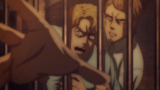 Odcinek był też pełen szokujących śmierci. Najpierw Yelena bez ostrzeżenia zastrzeliła Grieza, który tak nieprzyjemnie wyrażał się o Sashy przy Niccolo. Było to bardzo brutalne i przypominało, że to anime nie jest przeznaczone dla dzieci. Podobnie postąpiła Pieck, która zadźgała wartownika, aby dostać się w pobliże Erena. Jej konfrontacja z Jaegerem niemal się nie powiodła, ale swój cel osiągnęła, aby zwabić go na dach budynku. Tak naprawdę większe napięcie odczuwało się właśnie tam, a nie w pomieszczeniu, gdzie przewagę psychologiczną miał posiadacz Tytana Pierwotnego. Gdy bohaterowie weszli na dach, emocje wzrosły, a do tego bardzo dobra animacja (świetnie narysowane Pieck i Gabi) pozwalała się lepiej wczuć w te nerwowe oczekiwanie, co się wydarzy. Gdy bohaterka wskazała palcem na Erena, pokazując, gdzie znajdują się jej sprzymierzeńcy, rozpoczęła się w końcu widowiskowa akcja. Galliard w formie tytana zaatakował niespodziewanie Erena, a do tego do ofensywy ruszyły wojska z Mare z Reinerem na czele. Zupełnie tak, jakbyśmy wrócili do samego początku tego sezonu, gdy atakował Fort Slava. Isayama lubi zabawy w analogie, bo wcześniej też dostaliśmy przykład z opaskami, które przypominały te z Mare i getta. To udany motyw, aby pokazać, że historia zatacza koło.