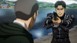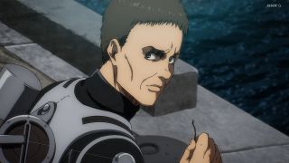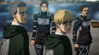 W pierwszej części odcinka Attack on Titan bohaterowie dotarli do portu, gdzie musieli opracować plan działania. Czas gonił, ponieważ według Hange tytani dotarli już do wybrzeży Mare, dlatego należało podjąć szybką decyzję, jak przejąć latającą łódź. Armin, Connie, Jean i Mikasa nie chcieli używać przemocy przeciwko Jaegerystom. Z kolei Wojownicy byli gotowi na wszystko, a Annie znowu prowokacyjnie pytała Armina o plan. Tym razem nie było w tej konfrontacji żadnego napięcia. Dopiero gdy Magath próbował wymusić na upartej Yelenie informacje, a następnie przepraszał mieszkańców Paradis, że źle ich ocenił, można było poczuć drobne emocje. Jego postawa pozytywnie zaskoczyła, ale też trochę zbyt szybko nastąpiła, bo pod wpływem widoku Gabi. Ale za to była ważna, ponieważ zmobilizowała bohaterów, żeby spróbowali bardziej pokojowego rozwiązania, nieuciekającego się do przemocy i rozlewu krwi.