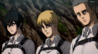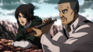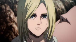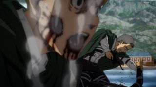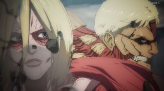 Z kolei Floch, którego trochę podpuszczała Azumabito, nie chwycił przynęty, domyślając się, że coś tu jest nie tak. Niespodziewanie tuż przed strzałem został obezwładniony przez tę kobietę, która pokazała siłę swojego klanu. Ale nie było już odwrotu i Mikasa wkroczyła do akcji w efektowny i wybuchowy sposób. Została świetnie zanimowana, dzięki czemu jeszcze bardziej imponowała jej sprawność fizyczna. Floch zdołał wezwać wsparcie, dlatego do gry wkroczyli Annie i Reiner. Miło było zobaczyć ich w akcji ze sprzętem do przestrzennego manewru. Studio MAPPA udowodniło, że potrafi pokazywać te charakterystyczne ruchy w powietrzu i przy dużej dynamice. Doskonałe też były kadry, gdy bohaterowie przemienili się w tytanów. Rozpoczęła się ostra jatka, gdzie animacja robiła wrażenie.