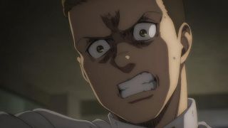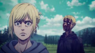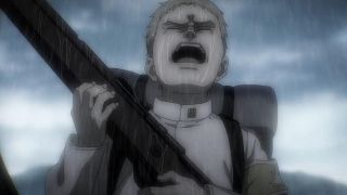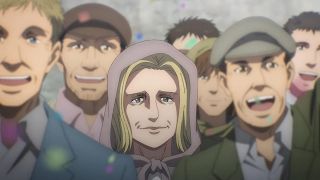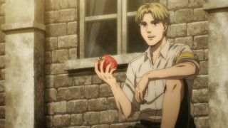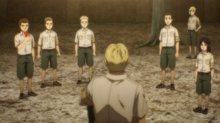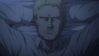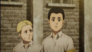 Podobnie jak w mandze, w anime odcinek opierał się na wskazywaniu analogii między Reinerem a Erenem. Ich mordercze groźby brzmią tak samo. Podobnie wygląda też szaleństwo w ich oczach. Widzimy mury, za którymi są zamknięci, treningi i obóz dla ocalałych. Podobieństwo możemy też dostrzec w grupkach przyjaciół między wojownikami Reinera oraz Erenem, Mikasą i Arminem. Ale co najważniejsze te analogie wcale nie wydają się wymuszone czy na siłę wciśnięte do historii. Końcówka epizodu doskonale podsumowała wątek Brauna, w którym zobaczyliśmy Erena! Każdy z nich przeszedł swoje piekło, które w zasadzie się niewiele się od siebie różni, a nowe pokolenie znowu rozpoczyna kolejny cykl wojen i cierpień. Jaegera widzieliśmy już w poprzednim odcinku, ale teraz jego tożsamość została wyjawiona, co wzbudziło wielką radość. Chłopak stał się mężczyzną z długimi włosami i zarostem, co stanowi bardzo dobry kamuflaż do szpiegowania.