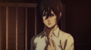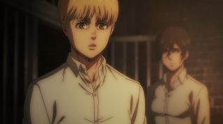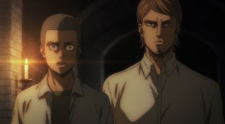 Twórcy jednak dozowali nam tę walkę, wplatając w nią jeszcze poboczne wątki. Z jednej strony zobaczyliśmy, jak Gabi spotkała się z Coltem i Magathem (ten uścisk!). Przekazała ważne informacje związane z Erenem i Zekem. Jak widać, cała militarna akcja została skrzętnie zorganizowana i zaplanowana wraz z nadejściem sterowców z Reinerem. Przenieśliśmy się też do uwięzionych głównych bohaterów, których wypuścił z celi Onyankopon. Jednak nie okazał się zwykłym zdrajcą – nie znał planów Yeleny, a potem bał się o swoje życie. Z kolei Armin, Connie, Jean i Mikasa zaczęli debatować nad postępowaniem Erena. Każdy miał szansę wypowiedzieć swoje zdanie. Niepokojąco zabrzmiała Mikasa, która wydaje się być poruszona słowami Jeagera - najwyraźniej czuje, że było sporo prawdy w tym, co powiedział. Armin stanął w jego obronie, argumentując jego postępowanie. Ta dyskusja nieco wybijała z rytmu tego odcinka, ale była ważna, ponieważ postacie są przyjaciółmi Erena.