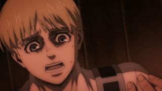 Z kolei Armin skonfrontował się z Mikasą. Znowu pojawiły się u niego wątpliwości, co do swojej wartości. Miał wyrzuty sumienia, że gdyby to Erwin przeżył, a nie on, to wiedziałby, jak postąpić w związku z Dudnieniem. Przemawiała przez niego bezradność, zagubienie i zdenerwowanie, dlatego zranił dziewczynę, nieświadomie wyrzucając z siebie, że Eren jest nie do odratowania. Z drugiej strony miał trochę racji, nakazując jej podejmowanie własnych decyzji, które nie są uzależnione wyłącznie od humorów Jaegera i jej obronnego instynktu. Mimo wszystko scena była na tyle przejmująca, że współczuło się Mikasie.