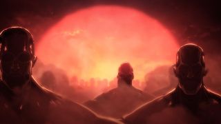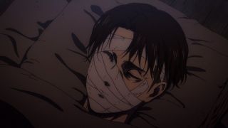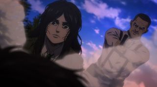 Natomiast Connie jechał wraz z Falco do Ragako, gdzie chciał nakarmić nim swoją matkę. Młodszy chłopak niczego się nie spodziewa, co powoduje wzrost emocji w tej historii. Odcinek nietypowo nie kończył się endingiem, tylko sceną z tymi bohaterami i napisami, a w tle można było usłyszeć instrumentalną wersję piosenki Ai Higuchi. Dzięki temu twórcom udało się wcisnąć wszystkie wątki z danego rozdziału tak, żeby widzowie nie odczuli pośpiechu, a jednocześnie płynnie przejść do ważnego cliffhangeru. W nim Hange zagadała do Pieck i Magatha, wskazując na obandażowanego Leviego. Zwiadowca odniósł poważne obrażenia, ale przeżył, co na pewno ucieszyło jego wierny fandom. Poza tym bohaterom będą potrzebne wszystkie „armaty” i ręce na pokładzie, żeby ogarnąć sytuację związaną z Dudnieniem. Ackermann będzie dużym wsparciem, który też dostarczy efektownej akcji, gdy jego stan się polepszy.