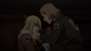 W najnowszym odcinku Shingeki no Kyojin tytani kroczący w stronę świata poza wyspą pozostawali w tle i to dosłownie. Trzeba przyznać, że wciąż robią miażdżące wrażenie, nawet będąc już w znacznej odległości od miasta. Historia skupiła się na Annie, której utwardzenie zniknęło po wywołaniu Dudnienia przez Erena. Dziewczyna została nakryta przez jej koleżankę Hitch, która zajmowała się rannymi i dostrzegła ślady jej obecności. Początkowo były nastawione do siebie dość wrogo, ale później nastąpiła fala wyjaśnień na czele z przyznaniem się przez Annie, że wszystko słyszała, gdy ona i Armin przychodzili w odwiedziny.