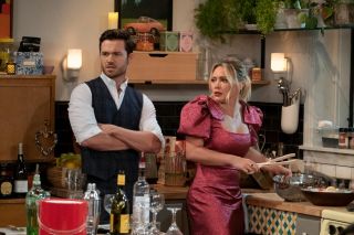 Wątek Sophie i Drew zakończył się oczywiście wyjawieniem prawdy i szczerą rozmową na dachu (fajne nawiązanie do Jak poznałem waszą matkę). Poświęcono też nieco czasu związkowi Charliego z Valentiną. Nie ma w nim żadnej chemii ani romantyzmu (jak to było u Lily i Marshalla), a sztucznie wykreowany pociąg seksualny zupełnie nie przekonuje. Problemem wydaje się tu Francia Raisa grająca Valentinę, która jest nijaka i podobnie jak Duff nie ma komediowego talentu. Jedynie od czasu do czasu ma przebłyski humoru, ale wynikające bardziej z gierek słownych. I do tego bardzo blado wypada przy Tomie Ainsleyu, który jest najbardziej wyrazisty z całej obsady. Owszem, gra w sposób przerysowany, ale nadaje swojej postaci charakter, przez co jest ciekawszy. Dzięki swojej charyzmie jest w stanie rozbawiać widzów nawet słabym żartem. W każdym razie wątek romansowy między Charliem i Valentiną jest tak koślawo napisany, że odechciewa się patrzeć na tę parę.
