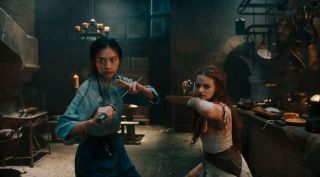 Każdy, kto oglądał wietnamską Furia, wie, że ten reżyser ma oko do scen akcji i świetne podejście do walk. Tutaj ma trudniejsze zadanie, bo walki - jak w każdym filmie akcji - muszą być widowiskowe, ale kręcone zgodnie z zasadą minimalnego ruchu, maksymalnego efektu. To sprzeczne z tym, jak walki są przeważnie kręcone (maksymalny ruch, minimalny efekt) i jak choreografowie do tego podchodzą. Można uznać, że jest to miks dwóch podejść, dający znakomity efekt, który jednocześnie nadaje temu filmowi charakter. Do tego dochodzi jeszcze dopasowanie choreografii do aktorek, bo mamy Joey King w tytułowej roli, która ma 167 centymetrów wzrostu i jest drobnej budowy ciała. Kreatywność choreografa w tym momencie staje się kluczem do jakości Księżniczki. Ona nie walczy jak mężczyzna ani nie kładzie jednym ciosem rosłych twardzieli. Kobieta jest nieźle sponiewierana, zmęczona. Widać, że przeciwnik w wielu momentach ma przewagę fizyczną. Joey King często sama wykonuje choreografie (twierdzi, że 90%), co dodaje tym scenom kolorytu. Z drugiej strony lepiej wypada Veronica Ngo, która współpracowała z reżyserem przy wspomnianej Furii. Ma doświadczenie w kinie akcji, więc choreograf pozwala sobie na jeszcze więcej. Twórcy scen walki są tutaj szalenie kreatywni, tworzą rozrywkę energiczną i satysfakcjonującą. Co prawda są momenty, gdy pojawiają się uproszczenia, a montaż nie zawsze działa idealnie, ale i tak dostarcza to oczekiwanych wrażeń.