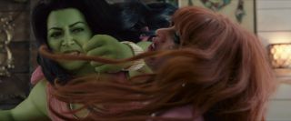 Domyślam się, że cały ten wątek miał mieć na celu skonfrontowanie Jennifer z jej kompleksami. Nie ma partnera, nikogo nie obchodzą jej sukcesy zawodowe. W ogóle wszyscy traktują ją tak, jakby przyjechała tam sprzątać i prasować. Łączą ją nawet w parę z psem! Napisałam, że mogę się tego jedynie domyślać, ponieważ nic z tego nie wybrzmiewa. Chciałabym, by główna bohaterka skonfrontowała się ze swoją przyjaciółką z dzieciństwa, która ewidentnie nie zaprosiła jej na ślub ze względu na sympatię. To mógłby być moment, w którym postać się rozwija i zyskuje odwagę, by postawić na swoim jako Jen, nie She-Hulk. Ale nic takiego się nie dzieje i właściwie po walce z Titanią, gdzie goście weselni są zachwyceni widowiskiem, nie wracamy już do tego, jak dziwne były okoliczności zaproszenia bohaterki na imprezę i jak źle ją na niej potraktowano. W ogóle sam atak naszej złowieszczej influencerki też pojawia się znikąd i jestem zła, że w 6. odcinku Mecenas She-Hulk Titania wciąż jest płaska jak telewizor. Twórcy po słabej walce o znak towarowy nic z nią nie robią. Jeśli dalej tak pójdzie, niedługo trafi do wora ze straconym potencjałem, tuż obok Clandestines z Ms. Marvel.
