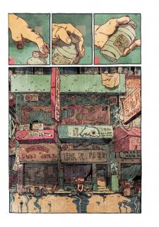 Zdecydowanie wielkim plusem jest szata graficzna komiksu. Na początku wzrok przyciąga gruba okładka z wyciętymi literami układającymi się w tytuł. Rysunki są celowo dość brzydkie, nie ma w nich eleganckiej kreski, widać inspirację mangą i anime, ale raczej tymi starszymi tytułami jak Akira czy Ghost in the shell (o których autor wspomina na końcu komiksu). Ważna jest gra kolorami, które z jednej strony są wyblakłe, ale jednocześnie pieczołowicie dobrane do pory dnia i pogody. Jeden rzut oka pozwala stwierdzić, jakie warunki panują podczas danej sceny. Miasto jest narysowane na tyle dokładnie, że widać wyraźnie, że to panazjatycka metropolia – ciasne uliczki, kable między budynkami, stragany, bazarki, okazjonalne napisy w chińsko-japońsko-koreańskim miszmaszu znaków. Graficznie ten komiks jest narysowany dokładnie tak, by zarówno miejsce jak i tematyka były oddane jak najlepiej. Rysunki pasują idealnie.