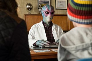 Wątek arcywroga Harry'ego i jego sojuszniczki też dostaje ważny rozwój. To jest właśnie kolejny mocny punkt programu, bo choć Resident Alien kapitanie bawi się humorem, a Tudyk bryluje na ekranie, sama historia rozwija się tak, że angażuje bez reszty i pozwala śledzić całość z zainteresowaniem. Oba odcinki pokazują coś zgoła odmiennego. Czwarta odsłona świetnie wykorzystuje kolację u burmistrza, na której dzieciak udaje, że godzi się z kosmitą. Ileż w tym niezręczności i dobrze prowadzonych gagów! A jako że miało to pozwolić na skopiowanie kluczy Harry'ego, to doprowadza do kolejnego wątku z odwiedzinami dzieciaków w jego domu. Takie motywy to nie tylko interesujące wyzwania dla bohatera, który życzy śmierci swoim wrogom, ale przede wszystkim pokaz, jak "człowieczeństwo" go zmienia. W końcu miał idealną szansę, by pozbyć się problemu, a zamiast tego zaprowadził dzieci do domu. Kontynuacja tego wątku w 5. odcinku kieruje wszystko w jeszcze inną stronę. Po udanej sugestii, by młodego wysłać jak najdalej stąd, mamy zawieszenie broni. Ta decyzja wydaje się wręcz idealnym twistem, który całkowicie zmienia tę relację. Scena w knajpce pokazuje, że nawet mogą być tu zalążki przyjaźni. Wychodzi to bardzo naturalnie i wiarygodnie. To szansa na to, że Resident Alien nigdy nie popadnie w stagnację i zawsze będzie oferował coś nowego.