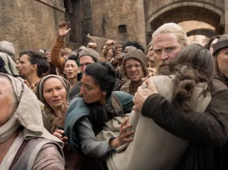fot. MaxInteresujący wątek zapowiada się w Smoczej Przystani. Pod nieobecność Otto Hightowera niewiele zostało z rozsądku i sprytu Zielonych. Paradowanie z uciętą głową smoka, gdy samemu się je reprezentuje na swoich flagach nie było najmądrzejszym rozwiązaniem. Ludzie nie wiwatowali z powodu zwycięstwa swojego króla, a raczej gardzili takim podejściem do tych świętych niemalże bestii. Głód w Królestwie się wzmaga, a nastroje społeczne lecą na łeb na szyję. Lud zaczyna się buntować przeciwko własnemu władcy i coraz mniej rozumie poczynania korony. Nie umyka to uwadze Mysarii, która słusznie sugeruje Rhaenyrze, że wojnę można toczyć na wiele sposobów. Wysłanie służki do Królewskiej Przystani sugeruje, że Czarni mają zamiar podburzyć bardziej tłum, by ten zwrócił się przeciwko swojemu władcy. To ciekawe i sprytne rozwiązanie. Mieliśmy też okazję lepiej poznać Hugh Młota, który wraz ze swoją rodziną próbował uciec z miasta, co ostatecznie się nie udało. Mam wrażenie, że serial skorzystałby jednak, gdyby twórcy zdecydowali się, czy chcą lepiej przedstawić tego bohatera nim stanie się istotniejszy. W tym momencie dostaliśmy z nim kilka mniejszych scenek, ale to nadal postać zagadka.