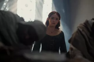 Helaena jest nadal niewykorzystana. Ktoś może powiedzieć, że w książkach jej rola była znikoma i zgodziłbym się z tym. Niemniej równie znikoma była rola Alicent, której wątek jest z kolei sztucznie przedłużany. Z tego powodu trudno jest mi przymknąć oko na to, że praktycznie nie dostajemy żadnej sceny z nią i Aegonem czy Aemondem po tym, co się stało. Dwie krótkie przebitki i jedno wypowiedziane zdanie nie załatwia sprawy w tym kontekście. Tym bardziej, że udało się znaleźć czas na bardzo ładną zresztą scenę między Rhaenyrą a Baelą, gdzie wspólnie wspominały poległą Rhaenys.