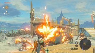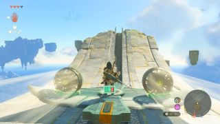 Kilka akapitów temu wspomniałem, że Link nauczył się nowych sztuczek. Całkowicie zmieniają one wrażenia z rozgrywki i pozwalają na robienie naprawdę niesamowitych rzeczy. Najmniej ekscytująca ze zdolności, Ascend, umożliwia bohaterowi szybkie wznoszenie się i przechodzenie przez sufity/podłogi. W ten sposób możemy nie tylko szybko wydostawać się z podziemnych lokacji, ale też na przykład zaskakiwać wrogów znajdujących się "piętro" wyżej. Rewind umożliwia cofnięcie pewnych obiektów w czasie, dzięki czemu możemy na przykład cofnąć platformę w miejsce, z którego ta przybyła, lub posłać głaz zrzucony przez oponentów prosto w nich. Najciekawiej wypadają natomiast Fuse oraz Ultrahand. Przy pomocy tego pierwszego możemy łączyć ze sobą dwa przedmioty w jeden i to praktycznie bez żadnych ograniczeń. Połączenie kija z kamieniem stworzy prowizoryczny młot, a gdy umieścimy tarczę na dwuręcznym mieczu, sprawimy, że będzie on w stanie blokować ciosy i strzały wystrzeliwane przez oponentów. Oczywiście kombinacji jest znacznie więcej i możemy pokusić się o zdecydowanie bardziej szaleńcze eksperymenty – na przykład połączyć miecz z wiatrakiem, hydrantem czy miotaczem ognia lub też zamontować rakietę na tarczy, co umożliwia jednorazowe wystrzelenie się wysoko w powietrze. Odkrywanie tego typu rzeczy daje ogrom frajdy!
