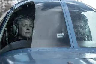 fot. AMCDlatego więcej emocji dostarczyła strzelanina między Darylem, Codronem, Fallou a ludźmi Jascinty, gdy samolot przygotowywał się do odlotu. Nasi główni bohaterowie wystrzeliwali przeciwników jak kaczki w parku rozrywki. Nawet Codron z jedną ręką na temblaku i jednym zdrowym okiem nie miał problemu z trafieniem w złoczyńców. Było to dość absurdalne, podobnie jak pościg motocyklem i autem za startującym samolotem. Przynajmniej zostało to dobrze nakręcone, choć nie dorastało do pięt podobnym ujęciom z premierowego odcinka. Szkoda, że twist z opuszczeniem awionetki przez Carol nie był zaskakujący. Ostatni strzał do zbirów nie dostarczył żadnych emocji, podobnie jak samobójcza śmierć Jacinty.