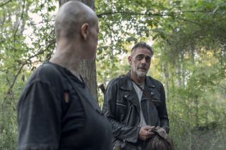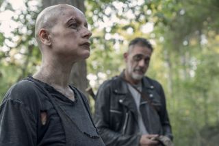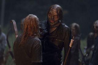 Negan i Alfa stają się intrygującym duetem, bo zasadniczo nadal nie wiemy, czy Negan tak na serio jest po ich stronie, czy ma jakieś ukryte cele? Czy zadziała, by ratować przyjaciółkę w osobie Judith? Wspólnie sceny Jeffreya Deana Morgana oraz Samanthy Morton mogą się podobać, bo aktorzy świetnie się dogrywają, budując relację, której chciałoby się więcej na ekranie. Zwłaszcza że oboje są w skrajnościach od siebie różni. Do tego Szeptacze mają niesamowitą scenę ociekającą klimatem, jakiego dawno w tym serialu nie było... Ten moment, gdy idą i recytują swoje motto zbiorczym szeptem obok hordy. Przyznaję - ciarki przeszły po plecach! W końcu Negan z maską!