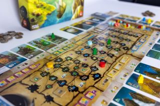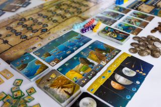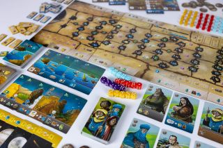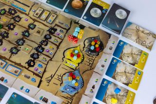 Nie będę się rozpisywał przesadnie o zasadach – te są na tyle rozbudowane oraz wymagające zapoznania się z komponentami, że mija się to z celem. Pozostanę przy ogólnym zarysie. Zadaniem graczy jest rozbudowanie swojej Karawany poprzez dodawanie zróżnicowanych kart. Dwa rodzaje (ląd, morze) rozwijają nasz silniczek, karty mieszkańców zapewniają bonusy, a karty nieba i inspiracji przede wszystkim służą do punktowania. Dochodzą do tego: kostki warunkujące nasze możliwe zagrania w turze, ulepszenia zwiększające możliwości tych ostatnich, kilkanaście możliwych akcji do wykonania dzięki pracownikom, żetony wpływu dające dodatkowe możliwości/zyski, dwa rodzaje surowców, tor Dziennika decydujący o zakończeniu rozgrywki (dający korzyści, ale stawiający też dodatkowe wymagania), kilka sposobów na zdobywanie punktów… Dużo tego!